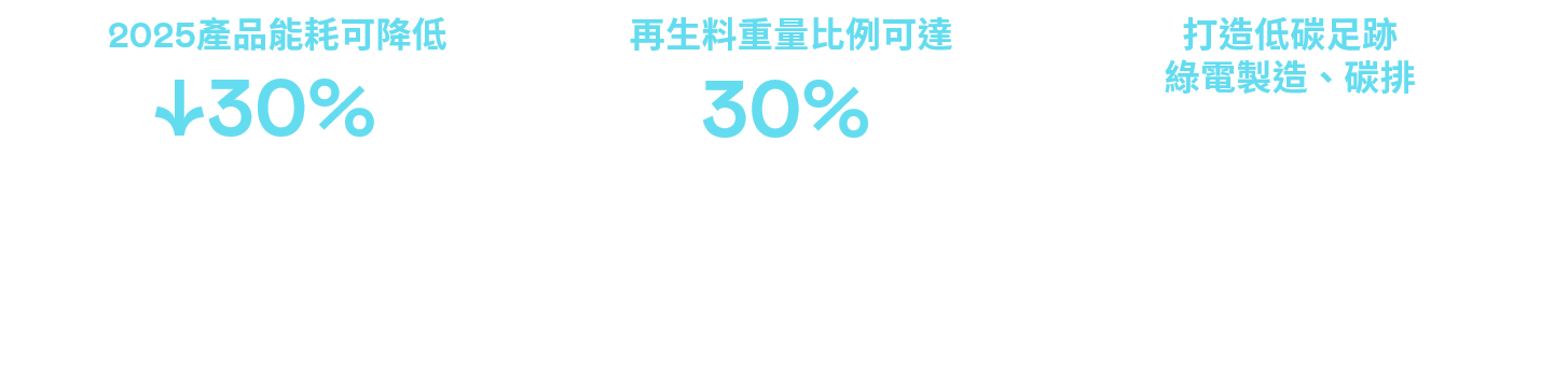 透過降低能耗、循環再生料與包材回收方式,投入更先進的研發能量,開拓綠色產品的市場與客戶合作共同推廣綠色價值觀,凝聚綠色溢價的減碳目標。